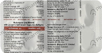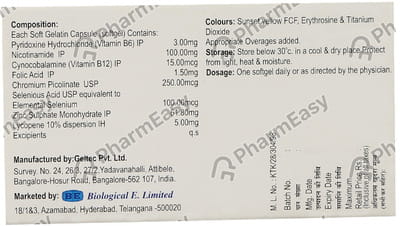 Contains | Vitamin B12 / Mecobalamin / Cynocobalamin / Methylcobalamin(15.0 Mcg)+Vitamin B9 / Folic Acid / Folate(1.5 Mg)+Vitamin B6 / Pyridoxine(3.0 Mg)+Chromium Picolinate(250.0 Mcg)+Elemental Selenium(100.0 Mcg)+Elemental Zinc(61.8 Mg)+Lycopene(5.0 Mg)+Niacinamide / Nicotinamide(100.0 Mg) |
