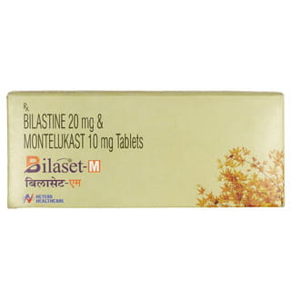 contains bilastine and montelukast as its active ingredient. This medicine acts by blocking the release of the chemical substance responsible for allergic symptoms. The side effects of Bilaset M Tablet include sleepiness, headache, dizziness, increased appetite, nausea, vomiting, and dry mouth. Take this medicine as advised by your doctor for the prescribed dose and duration. It is recommended to take this medicine without food and at the same time every day for optimum benefits. Bilaset M Tablet is not meant for relief from acute asthma, use your inhaler for asthma relief in an acute attack.