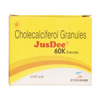 um in the body through the gut thus helps in bone growth and also by reducing inflammation. Vitamin D is produced naturally within the body when sun rays (UV rays) strikes the skin. It is sometimes known as the ‘sunshine vitamin’. Low levels of Vitamin D can cause weakness, fatigue, fragile or weak bones. Jusdee Granules is a fat-soluble vitamin, thus it is recommended to take it with meals for enhanced absorption in the body. Take it as prescribed by your doctor.
