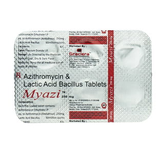 Myazi tablet is an antibiotic used to treat a wide range of bacterial infections. It is commonly prescribed for chest infections such as pneumonia, as well as sinus, ear, throat, lung, and skin infections. It is also effective in treating certain sexually transmitted infections (STIs), including gonorrhoea and chlamydia. The active ingredient in Myazi tablet is azithromycin, a broad-spectrum antibiotic that works by stopping the growth of bacteria responsible for the infection.