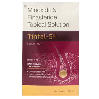 Tinfal F Skin Solution contains a combination of minoxidil and finasteride as its active ingredients. It works by dual mechanism of action and prevents hair loss and promotes regrowth of hair. Tinfal F Skin Solution should not be used in women due to the presence of finasteride, which may cause hormonal changes in females. It is meant for use on the scalp only. Avoid contact with eyes, ears, nose, mouth, or any cut/exposed skin or scalp.
