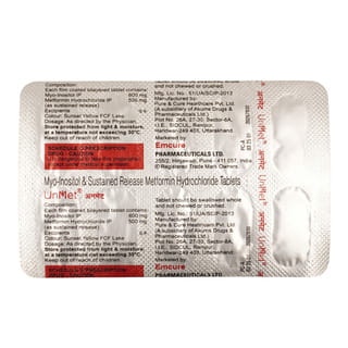 Myo-Inositol plays a key role in insulin signalling and ovarian function, helping restore normal ovulation and improve egg quality. Metformin reduces hepatic glucose production and increases cellular glucose uptake, thereby lowering insulin levels and improving hormonal balance. Together, they help regulate your cycle, promote ovulation, and support better metabolic function. This combined action makes Unmet tablet useful in improving fertility potential and menstrual regularity.