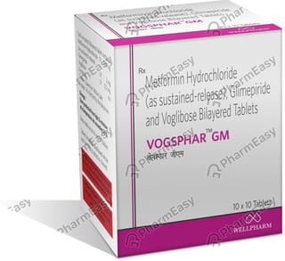 Vogsphar Gm tablet is an anti-diabetic medicine used to manage type 2 diabetes mellitus. It is a combination of metformin, glimepiride and voglibose as active ingredients. Do not miss any dose or abruptly stop taking this tablet without informing your doctor. Patients are advised to maintain a strict exercise and diet regimen in conjunction with this medicine to achieve the best possible effect.