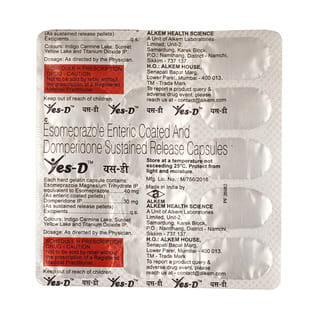 contains domperidone and esomeprazole. It works by reducing the production of stomach acid and increasing the motility of the stomach and intestines, thus preventing acid from flowing back into the esophagus. Yes D Capsule should be taken at least one hour before meals, as directed by your doctor. While using this medication, avoid foods that may increase acidity, do not lie down immediately after meals, and make sure your last meal is at least two hours before bedtime. The most common side effects include diarrhea, flatulence, stomach pain, dry mouth, and headaches. These side effects are typically temporary and usually resolve on their own over time. If you have any concerns about side effects, contact your doctor immediately. Before taking this medication, inform your doctor if you are pregnant, planning to become pregnant, or breastfeeding. Additionally, let your doctor know if you have liver disease, as this may affect the appropriate dosage for you.
